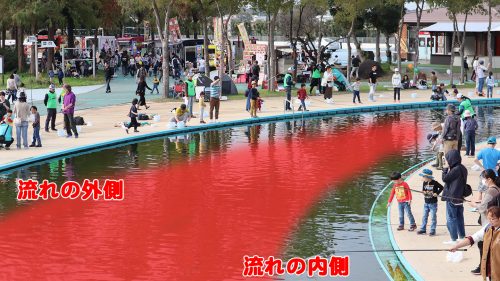 また、流れのある釣り場では写真のように曲がっている場所のほうが水の流れに変化がでて、流れが当たる外側の方が魚が好む場所になりやすいです。